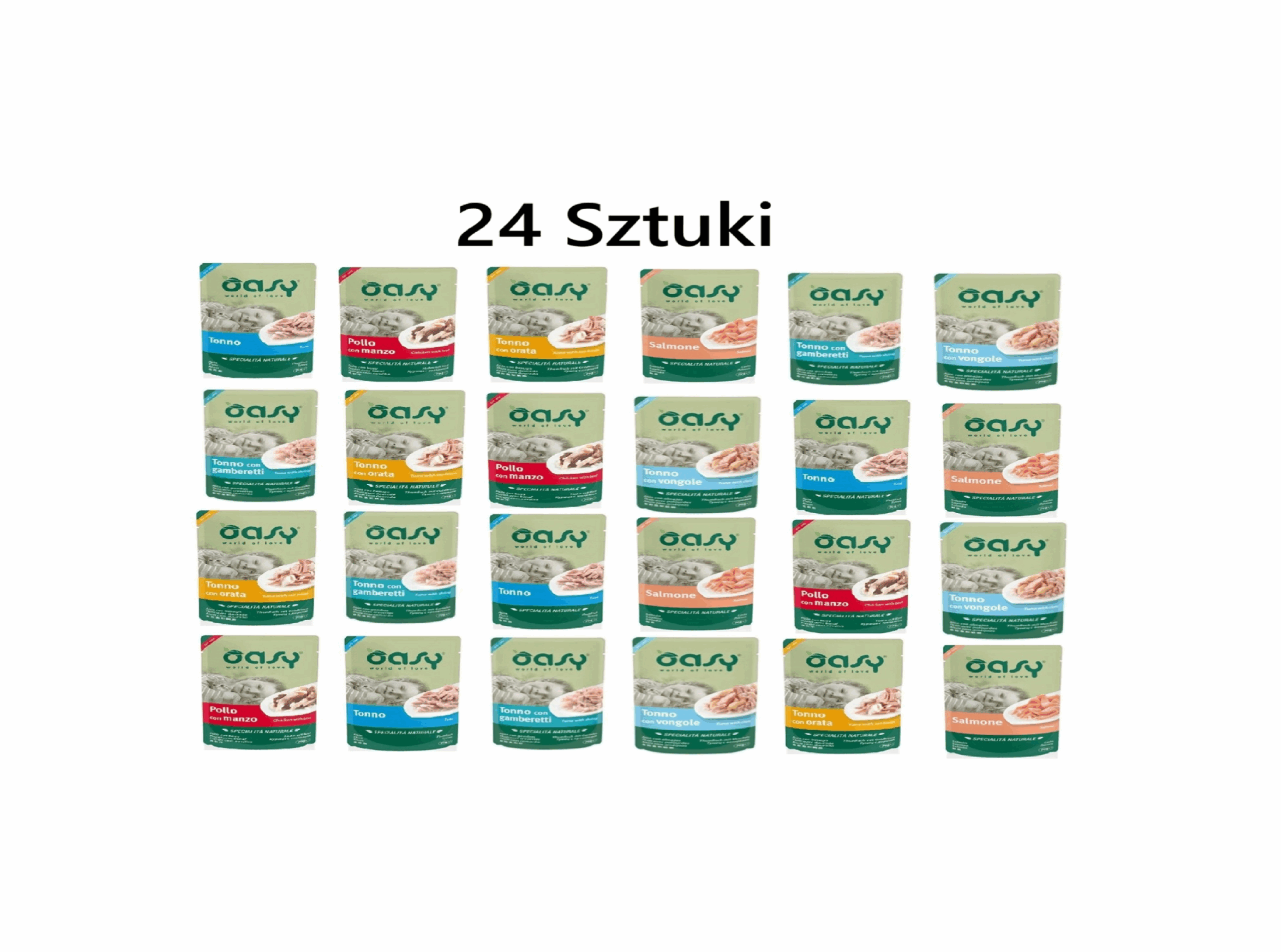 Na tej aukcji kupujesz zestaw karmy uzupełniającej dla kotów dorosłych OASY NATURAL – SASZETKA 70g x 24 Szt: