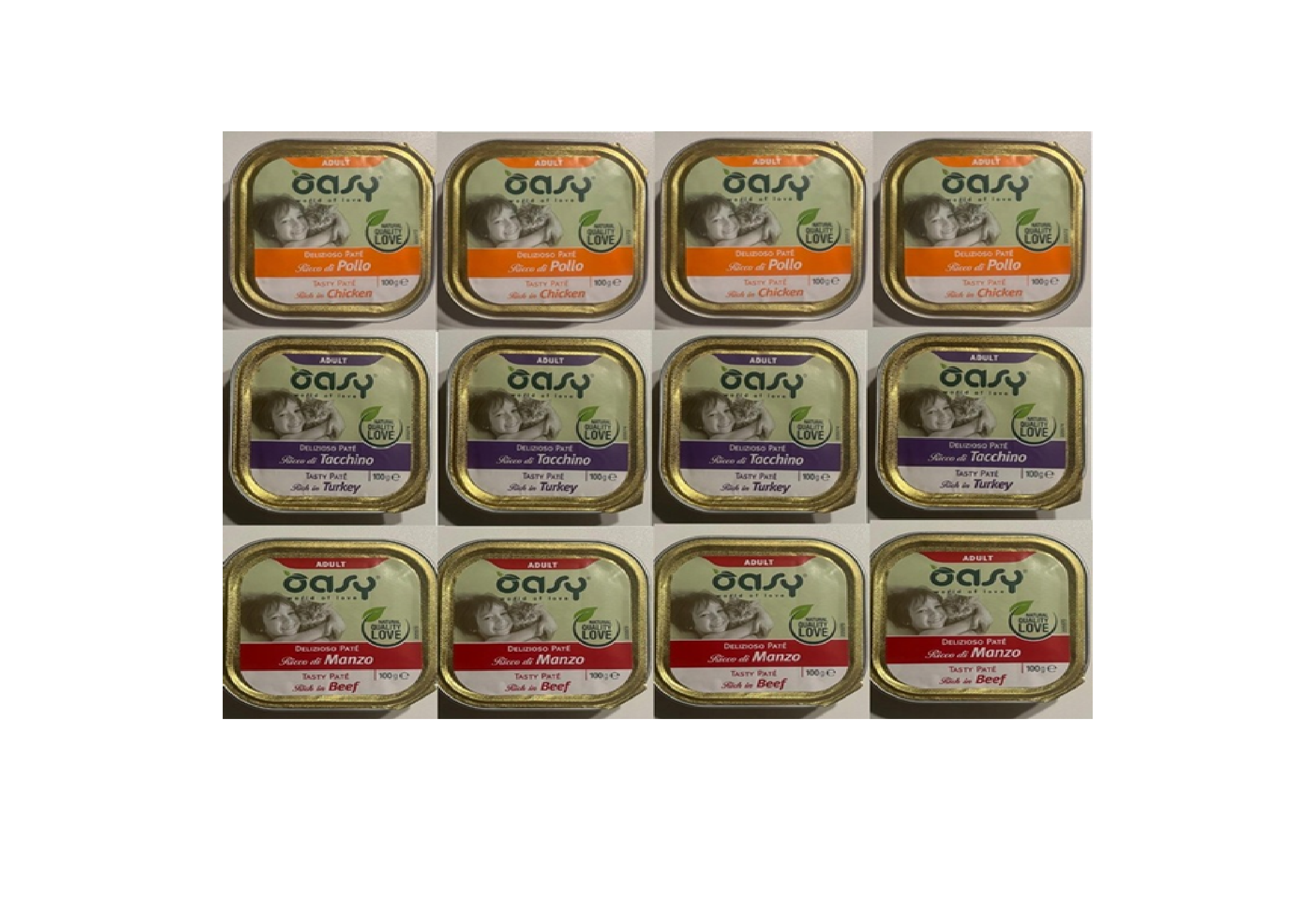 Kompletna pełnoporcjowa karma dla kotów wszystkich ras, w każdym wieku. Oasy Deliziozo Pate to gotowany na parze, smaczny i pełnowartościowy posiłek. Dzięki takiej metodzie przygotowania, gwarantuje wysoką strawność i doskonały smak. Te smakowite karmy przygotowywane są z naturalnych składników, o dużej zawartości białka zwierzęcego, bez zawartości zbóż – za wyjątkiem Sterilized z łososiem i ryżem.