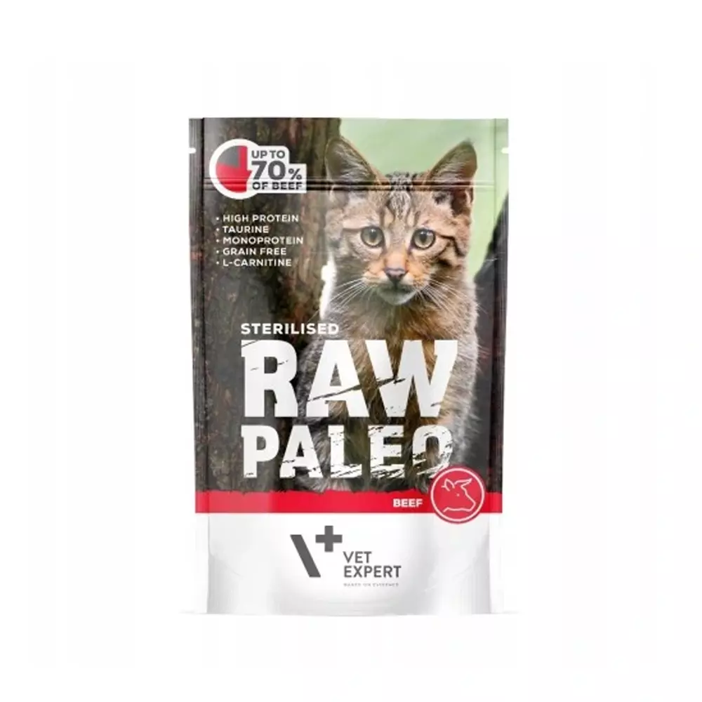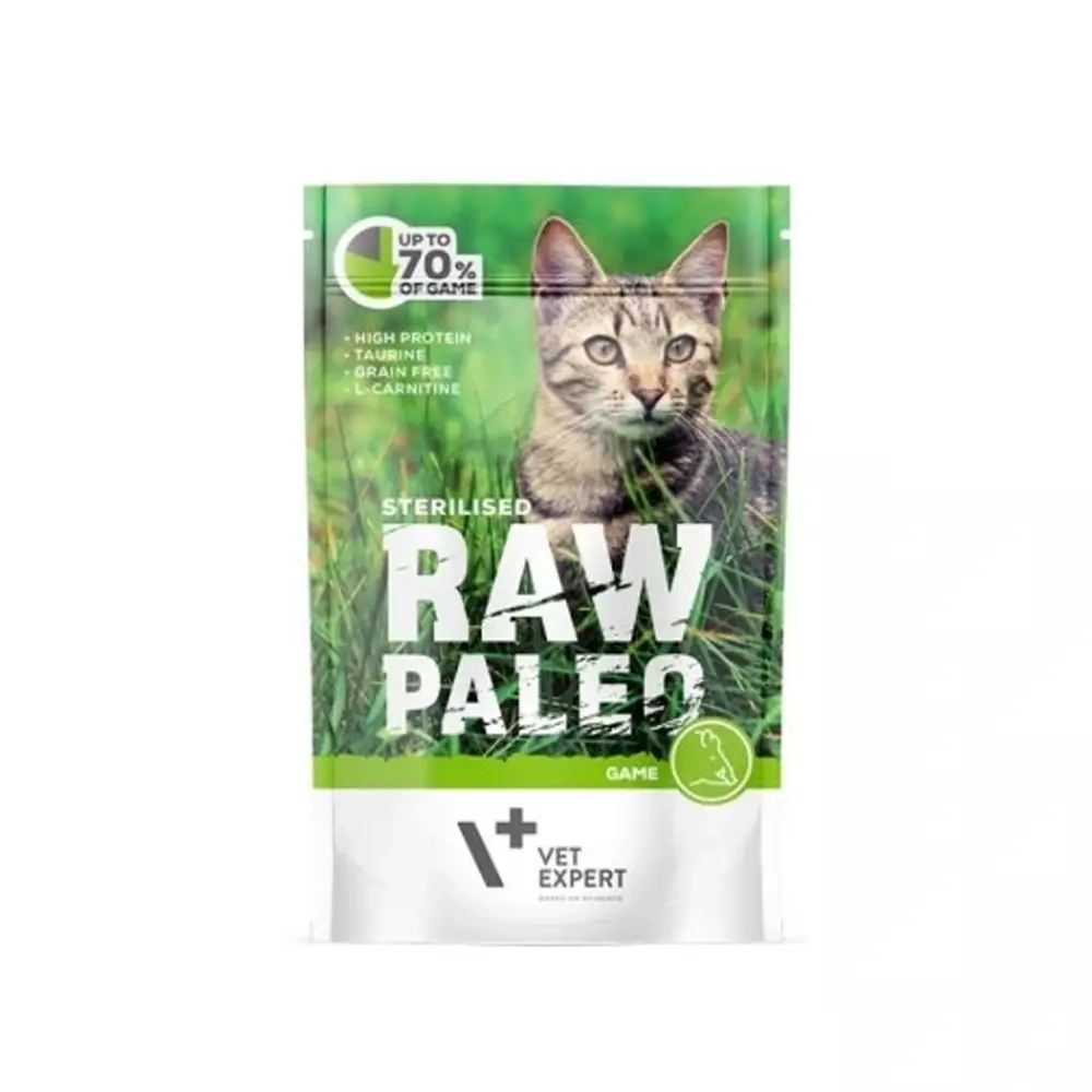 Karma mokra RAW PALEO Sterilised dla kotów dorosłych jest kompletną i zbilansowaną pełnoporcjową karmą bytową przeznaczoną dla kotów dorosłych z predyspozycjami do nadwagi lub otyłości, a także kotów wysterylizowanych i wykastrowanych.