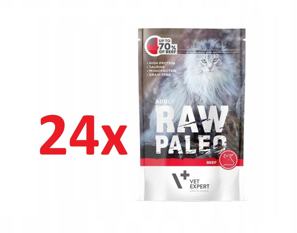 Karma mokra RAW PALEO dla kotów dorosłych jest kompletną i zbilansowaną pełnoporcjową karmą bytową przeznaczoną dla kotów dorosłych od ukończenia 1. roku życia. Karma nie zawiera zbóż (Grain Free) i jest jednobiałkowa, co oznacza, że wszystkie składniki pochodzenia zwierzęcego użyte do wytworzenia karmy pochodzą z wołowiny