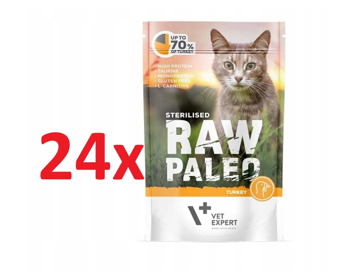 Karma mokra RAW PALEO Sterilised dla kotów dorosłych jest kompletną i zbilansowaną pełnoporcjową karmą bytową przeznaczoną dla kotów dorosłych z predyspozycjami do nadwagi lub otyłości, a także kotów wysterylizowanych i wykastrowanych.